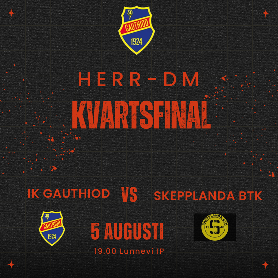 På måndag 5/8 spelar herrlaget kvartsfinal i DM. Skepplanda BTK gästar Lunnevi IP med matchstart 19.00. Väl mött!