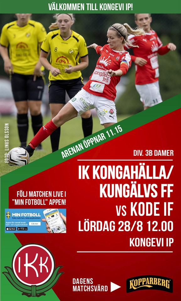 Klockan 12.00 är det avspark i det heta derbyt mot Kode på Kongevi! Damerna kommer revanschlystna efter förlust i premiären borta mot IK Zenith och Kode kommer närmast från storförlust mot IFK Göteborg. Räkna med en match i den derbykaraktär som sig bör med två lag som vill ta tre poäng! Truppen: Ellen Karlsson Therese Hedin Fina Maria Bjönness Josefine Hedén Ella Ohlson Ida Hedlund Veronica Nikell Julie Fanger Emma Hansson Vera Jacobsson Angelina Hoff Ebba Jacobsson Mikaela Gustafsson Andrea Rivero Dosantos Frida Nyqvist Tilda Persson Emma Hasselqvist Amanda Carlsbogård Vi hoppas vi får se många IKK/KFF supportrar som hejar fram tjejerna på plats i eftermiddag.