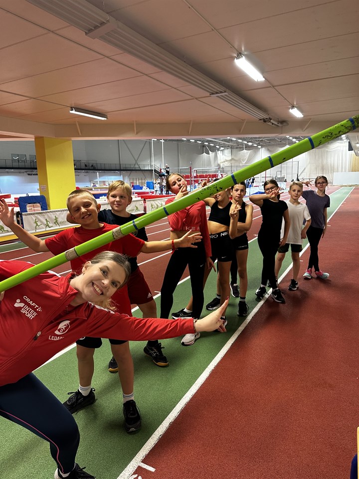 Hej! Det var härligt att träffa barnen igen efter lovet. Vi startade med jogg i 10 minuter. Barnen höll ett bra, individuellt, och jämnt tempo och "höll" hela vägen, vilket är roligt att se. Därefter blev det stretch och sedan löpskolning. Barnen utvecklas hela tiden och ökar sin kroppskontroll, koordination och spänst och vi kan då fokusera på att utveckla övningar som bidrar till ett fint löpsteg. Efter första delen av träningen tog vi av oss skorna och körde på "gula mattan". Här blev det en blandning av gymnastiska övningar blandat med styrka, koordination och spänst på ett tacksamt underlag, vilket bland annat sparar på barnens knän. Allt från framåt/ bakåt kullerbyttor, mångsteg, vristhopp m.m. till "harskutt", "armhävningshopp" och uthopp i stavhoppsmattan. Därefter blev det dags att prova stavhopp i längdgropen. Vi fokuserade på grepp och att våga "svinga" sig från mattan och ut i längdgropen. Vi testade med både stående ansats samt med en kortare ansats. Efter några hopp var, var det dags för ett avslutande styrkemoment med medicinboll. Barnen körde både individuellt samt i par. I slutet samlades vi för en kort avstämning. Guldkorn från oss tränare till barnen var en fin och uthållig löpning vid uppvärmning samt ett grymt fokus på träningen. Vår upplevelse av träningarna är att de flyter på i ett bra tempo med högt fokus. Vi lägger minimalt med tid på tillsägelser och kan utföra de aktiviteter vi tänkt oss utan avbrott. En stor klapp på axeln till era barn som ger oss möjlighet att ge dem en god och utvecklande träningsupplevelse. På torsdag kör vi vidare i Äsperödshallen kl 17:30-19:00. Ha en fin dag! Tränarna