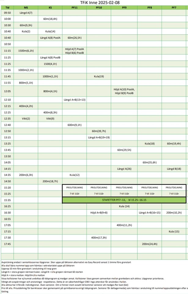 Hej! Nu har tävlingsprogram kommit för "Tfik Inne" i Rimnershallen nu på lördag. Kevin tävlar i Pf11 (60m kl 10.40, höjd kl 11.15, längd kl 12.10, 600m kl 12.40) Karl och Git i Pf10 (båda kula kl 11.45, båda 60m kl 12.50, båda längd kl 13.15, Karl höjd kl 16.30, båda 400m kl 17.30) Gemensam prisutdelning alla kl 15.20. Vill ni springa stafett är det kl 15.25-16.15 (om ni vill kan vi få ihop lag med andra träningsgrupperna i orient, skriva kommentar här nedan i så fall om ni vill köra stafett). Upprop sker 10min innan respektive grenstart vid platsen för grenen. Nummerlapp hämtas på läktaren sekretariatet. Ingen avprickning för er. Info ligger också på Tfiks hemsida (https://www.svenskalag.se/trollhattanfik-tfikinne) men bifogar bild på tidsprogrammet här.