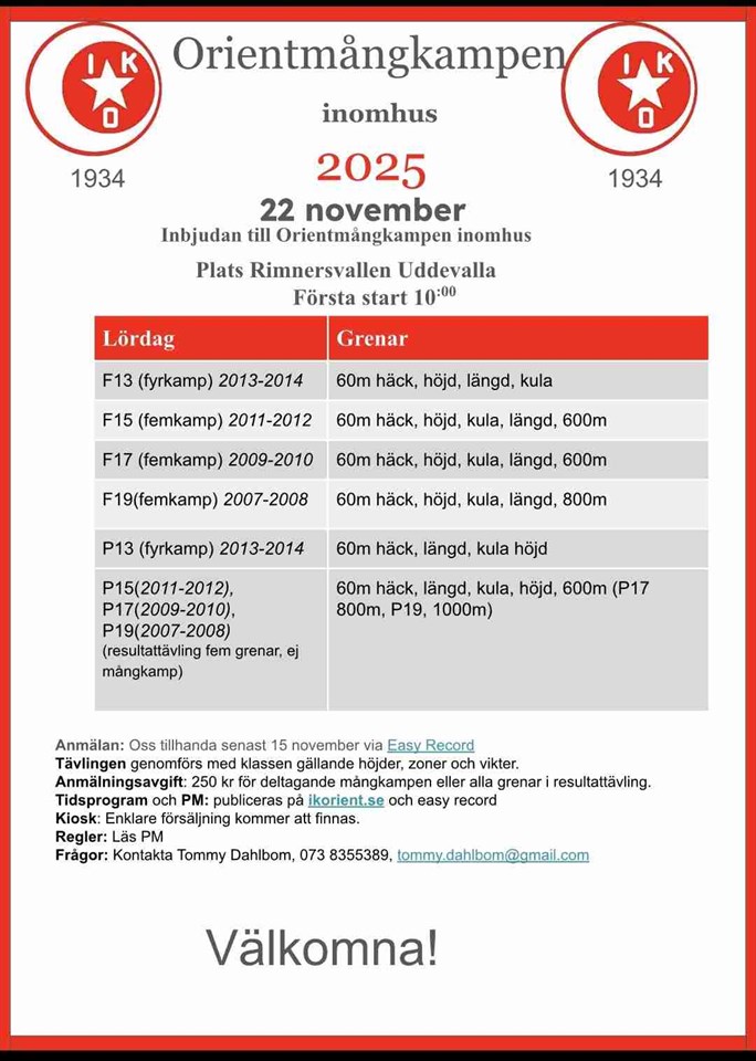 Hej! Samma kväll, två tävlingar i en, från kl 17 i Rimnershallen. Passa på med hemmatävling :) Heter höstkampen för er som är födda 2015 (tävlar i FP11 nu från inomhussäsongen börjar) och Skololympiaden för er födda 2014. För er födda 2015 finns grenarna 60m, längd och kula att välja på. För er födda 2014, se bild för grenar. Skriv senast 4 november nedan i flödet vad ni vill köra, så anmäler vi. Ni födda 2014 tävlar också för er skola, så skriv med det här i flödet också. Välkomna! Ledare finns på plats. //Ledarna