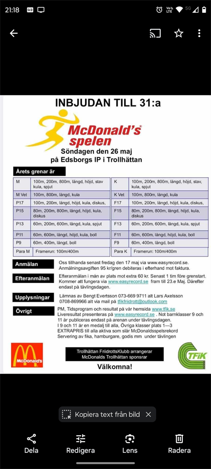 Ytterligare en tävling som barnen kan anmäla sig till, McDonaldsspelen i Trollhättan den 26 maj. Samma här, skriv namn, födelseår och vilka grenar barnet vill tävla i så anmäler jag dem. Gör detta senast 16 maj. Jag vet inte i dagsläget hur det ser ut med ledare på denna tävling heller, så ni vet. Mvh ledarna genom Frida Grupp 14/15 röd 11 apr 2024 13kommentarer