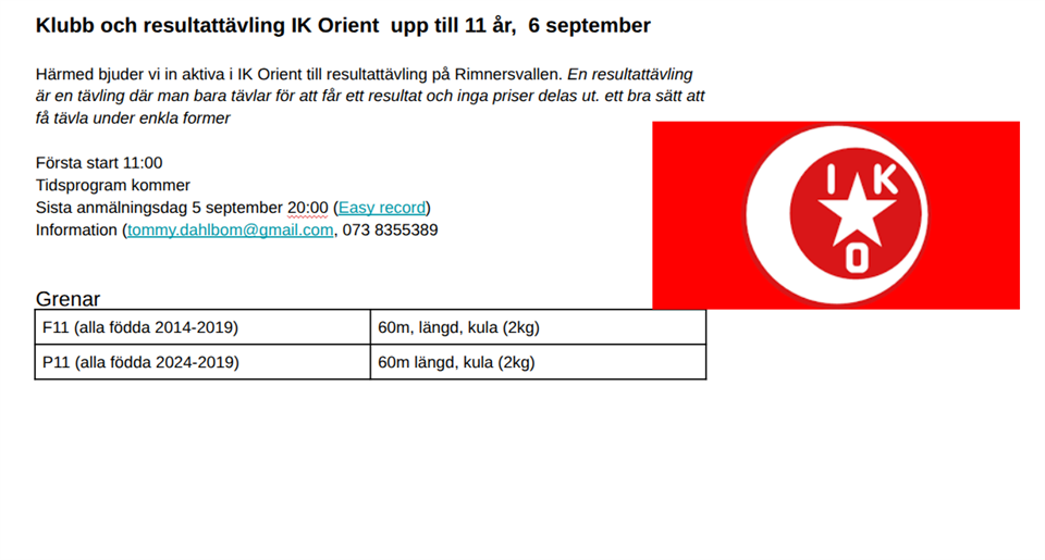 Hej Snart kommer info ut om träningsstart för gruppen. Här kommer en inbjudan till resultattävling på Rimnersvallen 6:september med start 11:00 Grenarna är 60m, längd och kula. Alla anmäler sig i samma klass (F11 eller P11) Man anmäler sig själv på Easy record. Info finns i inbjudan Resultattävling 6 september Ha det bra så ses vi snart Grupp 16 10 aug 2025 0kommentarer