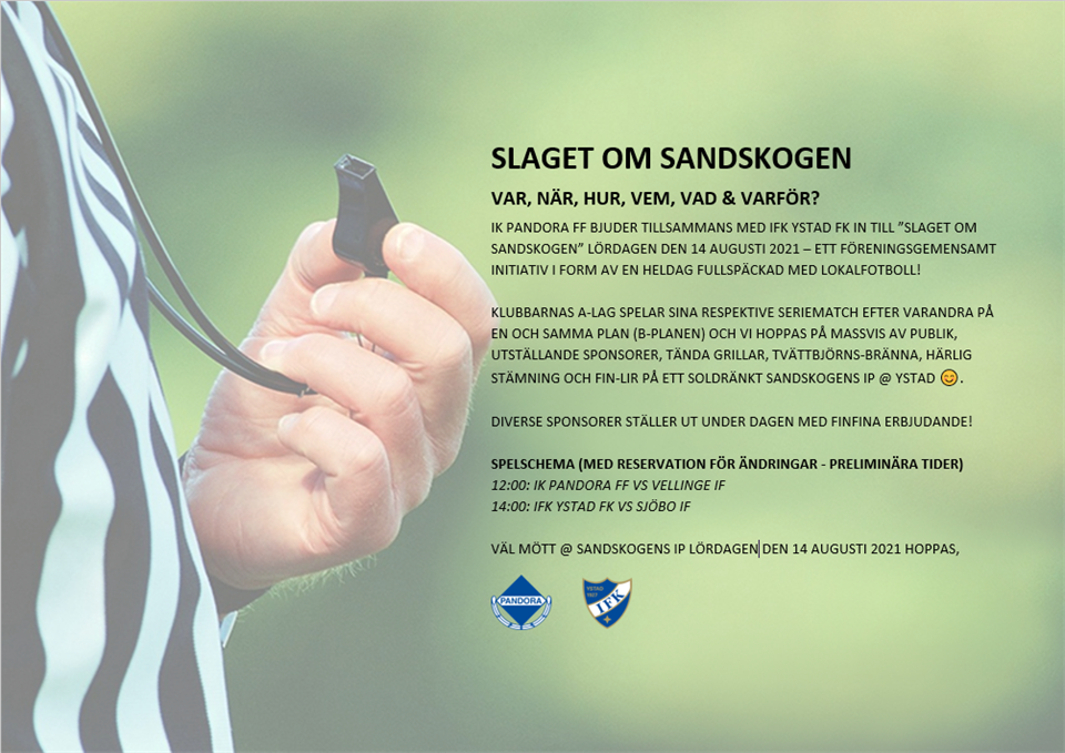 IK PANDORA FF BJUDER TILLSAMMANS MED IFK YSTAD FK IN TILL ”SLAGET OM SANDSKOGEN” LÖRDAGEN DEN 14 AUGUSTI 2021 – ETT FÖRENINGSGEMENSAMT INITIATIV I FORM AV EN HELDAG FULLSPÄCKAD MED LOKALFOTBOLL! KLUBBARNAS A-LAG SPELAR SINA RESPEKTIVE SERIEMATCH EFTER VARANDRA PÅ EN OCH SAMMA PLAN (B-PLANEN) OCH VI HOPPAS PÅ MASSVIS AV PUBLIK, UTSTÄLLANDE SPONSORER, TÄNDA GRILLAR, TVÄTTBJÖRNS-BRÄNNA, HÄRLIG STÄMNING OCH FIN-LIR PÅ ETT SOLDRÄNKT SANDSKOGENS IP @ YSTAD :). DIVERSE SPONSORER STÄLLER UT UNDER DAGEN MED FINFINA ERBJUDANDE! SPELSCHEMA (MED RESERVATION FÖR ÄNDRINGAR - PRELIMINÄRA TIDER) 12:00: IK PANDORA FF VS VELLINGE IF 14:00: IFK YSTAD FK VS SJÖBO IF VÄL MÖTT @ SANDSKOGENS IP LÖRDAGEN DEN 14 AUGUSTI 2021 HOPPAS, IK Pandora FF & IFK Ystad FK