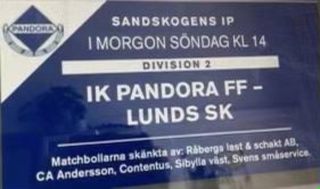 Söndagen den 20 juni kl. 14:00 @ Sandskogens IP (A-planen) är det seriepremiär i Div.2 Södra Götaland. IK Pandora FF välkomnar Lunds SK som står för dagens motstånd i det historiska mötet. Vi tackar följande matchbollsponsorer; Råbergs Last & Schakt AB CA Andersson Sibylla väst Contentus SVENS små service - Max 100 åskådare hälsar FHM, Skåneboll och IK Pandora FF - Inträde SEK 40:-/person > 18 år - Kassan öppnar 1 timme före avspark