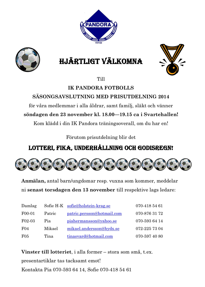 Hej alla duktiga A-lagsspelare och föräldrar till damer/flickor i de olika lagen. Hoppas ni hade ett fint slut på 2014 och att 2015 startat som ni önskat. Jag heter Peter Johannesson och är styrelsemedlem i IK Pandoras Fotboll sedan ett par år tillbaka. Min dotter Maia Wahlberg spelar i F02. I år 2015 kommer jag att vara sponsoransvarig. Vi håller på med det grundläggande sponsorupplägget i styrelsen, just nu. Vi tänker tillsätta en sponsorgrupp, om 3-5 personer, bestående av aktiva spelare från A-lagstruppen och/eller föräldrar till damer/flickor i de olika lagen. Jag vet och har hört med egna öron att det finns mycket energi och ett stort engagemang hos alla er. Ju fler vi är som hjälps åt, desto fortare kommer vi att se resultat. Du som är intresserad, v.v. hör av dig till mig via mail eller telefon senast 11/1, så skall jag förklara upplägget och vad vi tillsammans skall göra. Mvh Peter Johannesson peter.johannesson@pmchydraulics.se Sponsoransvarig IK Pandora Fotboll Tel. 0705869004