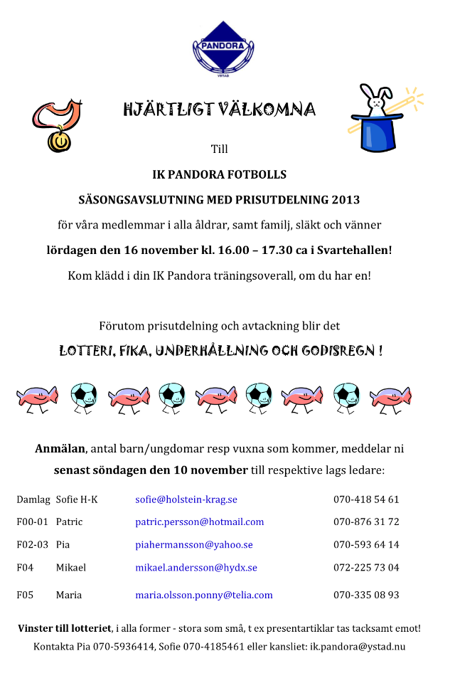 Säsongsavslutningen äger rum i Svartehallen lördag 16/11 kl. 16.00 - 17.30 ca. Kom klädd i din Pandora träningsoverall, om du har en. Förutom prisutdelning och avtackning blir det lotteri, fika, underhållning och godisregn! Anmälan till resp lags ledare senast söndag 10/11.