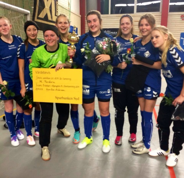 .. damlaget till vinsten i B-slutspelet i Köpingebro IFs Damcup i lördags. Särskilt grattis till Mathilda Holm som utsågs till matchens lirare i B-slutspelets final och även blev skyttedrottning. Bra recept: 6 spelade och vunna matcher, 21 gjorda mål, 3 insläppta mål och 6 olika målskyttar. På bilden från vänster: Malin Hansson, Tilde Olsson, Sofie Andersson, Fanny Holstein-Krag, Mathilda Holm, Amy Jeppsson, Matilda Persson och Stephanie Wallin. Saknas gör Elin Jönsson och Angelica Jönsson, tränare Mirza Huremovic och lagledare Michael Persson.