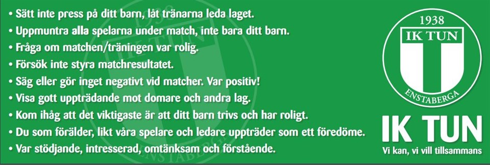 Sörmlands fotbollsförbund lanserade kampanjen ”Tillsammans för trygg fotboll” till denna säsongen. Vi i laget vill inte vara sämre och hjälper gärna till att sprida budskapet för att få ett bra och lärande klimat på alla barn och ungdomsmatcher. På bilden syns IK Tuns nya fina skylt som sitter på kiosken vid Råsbäcksplanerna. Utdrag från Sörmlands fotbolls facebook ”Under denna säsong kommer vi sätta fokus på att vi har en bra miljö och stämning runt våra barn- och ungdomsmatcher. Vi vill att våra unga spelare, domare och ledare ska få möjlighet att utvecklas och utbildas i en matchmiljö som de känner sig trygga i. Att matchen ska vara ett tillfälle av glädje, lärande och kompisskap. Delar i detta arbete kommer ni märka i att vi kommer att synliggöra matchvärdarna mera med nya västar till alla föreningar. Vi har en ny domartröja med budskapet på och vi från förbundet kommer besöka fler matcher för att följa upp matchspelet mera. Vår önskan är att vi runt våra lag alla hjälper till för att skapa den bästa barn- och ungdomsfotbollen vi kan!” Här ett par länkar där ni gärna kan läsa mer om kampanjen. https://youtu.be/fsaSjOxJNJE https://www.facebook.com/Sodermanlandsfotbollforbund Påminner även om de dokument som finns på här vår lagsida. Använd webbversionen för laget och kika under Mer – dokument. Här finns det information om Spelformen 7 mot 7, Tips och råd för fotbollsförälder samt Information för matchvärdar Vi i laget hoppas att ni kan ta en liten stund och läsa igenom detta. Hälsningar ledarna
