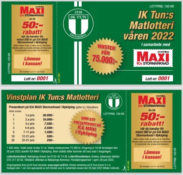 Här kommer lite förhandsinforamtion om att vi kommer återigen sälja lotter till IK Tuns matlotteri. Lotterna får vi i början av April. 6 st lotter per spelare ska säljas och dessa är ej möjliga att lämna i retur. Passa på redan nu att fråga runt. Mer information kommer närmare. Redovisning görs till mig via swish (0702222956). Då jag kommer hålla ordning på två lags redovisningar så skriv gärna P11-12 följt av barnets namn. Tack! /Emma Nedan finns info från klubben. Bäste medlem och förälder i IK Tun Alla ni fantastiska spelare, ledare och föräldrar har hittills sett till att vi är där vi är idag. För att vi ska kunna fortsätta utveckla föreningen och vår idrottsplats, ha roligt, kunna hålla en hög nivå på vår verksamhet, i form av att alla ska kunna träna, spela matcher, åka iväg på cuper etc. samt naturligtvis ha väl utbildade ledare/tränare så måste vi alla hjälpas åt. Ingen kan göra allt, men alla kan göra lite. Därför har föreningen beslutat att göra 2 medlemsaktiviteter under säsongen. Nu är det medlemmarna, d.v.s. vi alla i föreningen som ska göra dessa. Naturligtvis måste ni föräldrar vara lite behjälpliga och vara med och stötta de yngsta ungdomarna (tänk på att det är du som medlem som är föreningen). Matlotteri Vi kommer fortsätta med matlotteriet i samarbete med ICA Maxi. Vi ska sälja 1500 lotter a 100 kr. Lotteriet startar i 1/4 och utlottningen är den 30/6 klockan 18.00 utanför ICA Maxi. På varje lott finns en rabattkupong på 50 kr som gäller för ett köp på ICA Maxi. Halva vinstsumman från lotteriet kommer gå till ungdomssektionen. Alla seniorer, styrelsemedlemmar, samt ungdomsspelare födda 2015 eller äldre säljer 6 lotter var. Säljer laget fler lotter så går 25 sek per lott till lagkassan av de extra lotter laget säljer. Alla lotter skall betalas in lagvis senast onsdag 22/6. OBS! Dessa lotter är ej returnerbara, dvs. alla lotter skall säljas.