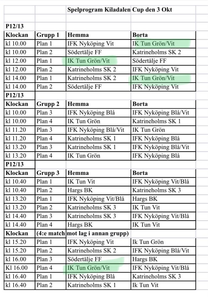 På söndag är det dags för cup. Vi har 4 matcher på spelschemat. Vårt lag heter IK Tun Grön/vit. Matchtiderna är 10, 12, 14 och 16 om det inte blir någon sen förändring. Samling inför första match 9:30 vid Råsbäcksplanerna. Matcherna spelas 2 x 15 min. Tänk på packa med matsäck och kläder efter väder. Kiosken kommer vara öppen och där kommer även hamburgare att säljas. Omklädning hemma. Vi återkommer med info om matchställ för Adam och Leo B. Vi ska även täcka kiosken en liten del av dagen. Kioskschema kommer här. Vill man byta tid så får man göra det själv. Allt som behövs ska finnas på plats så det är bara att dyka upp. Bekräfta gärna med en kommentar här under att ni sett er tid. 8:30-10:00 – Måns, Melwin & Alwin 9:30-11:00 – Adam 10:00-11:30 – Taher, Leo Nu laddar vi för en härlig söndag! P-13/14 28 sep 2021 4kommentarer