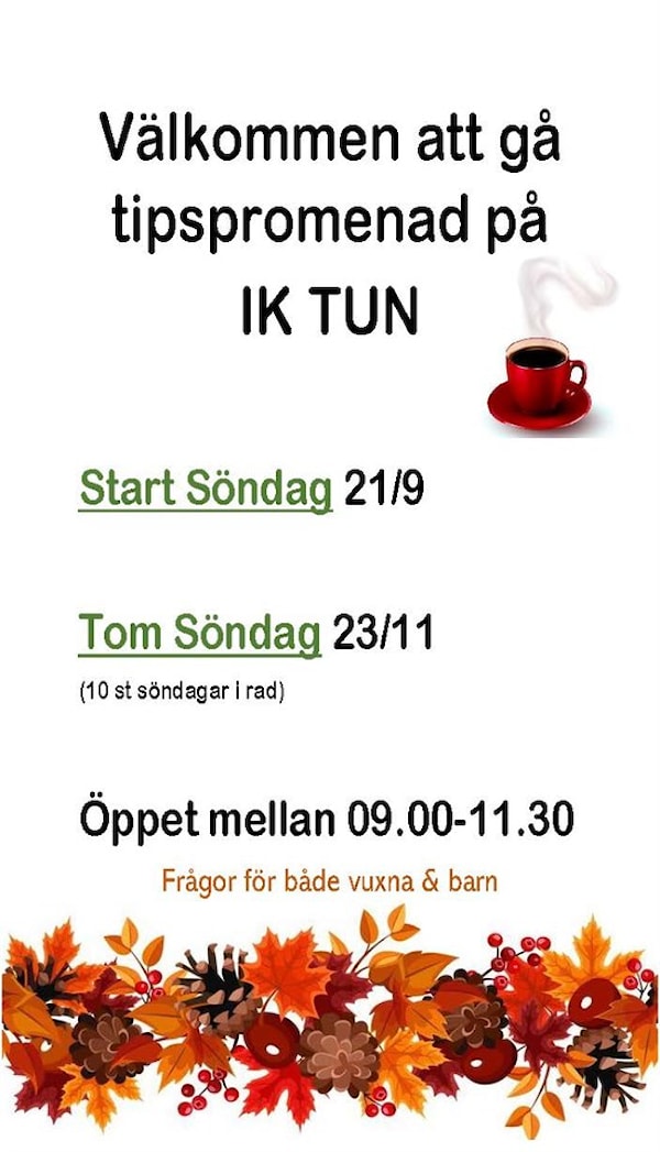 Välkomna till Söndagens Tips o Bingopromenad vid Enstaberga IP. På naturskönt spår kan du knalla runt mellan kl 09.00-11.30
