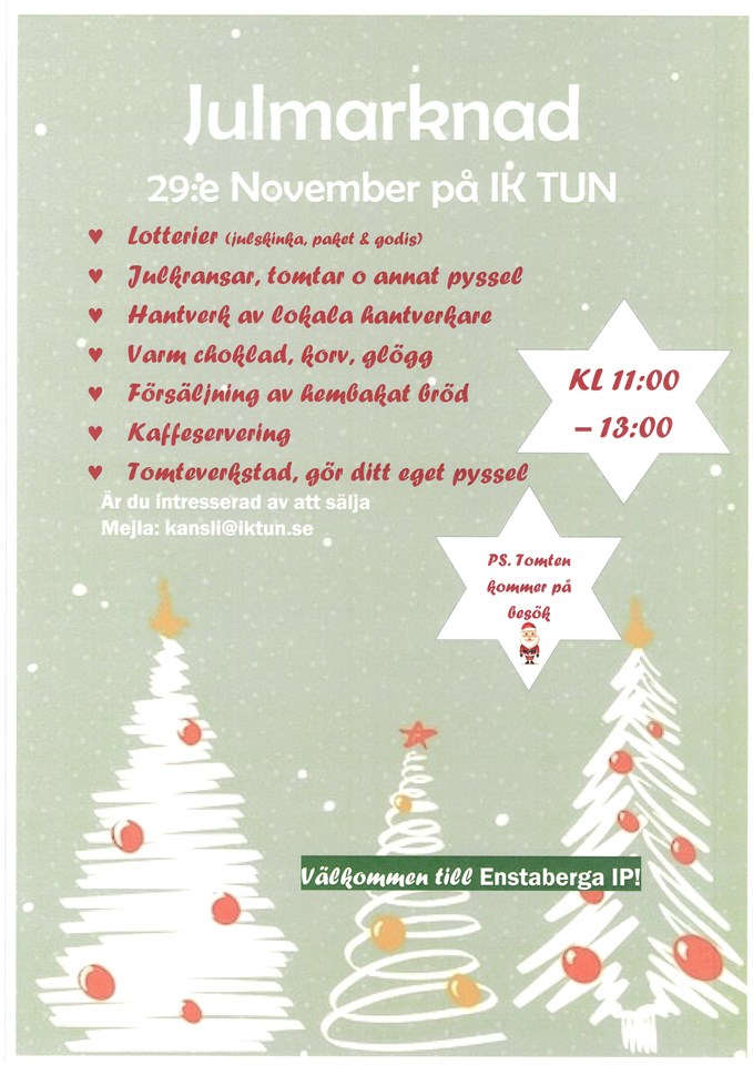 Välkomna på IK Tun:s Julmarknad Lördagen den 29 Nov kl 11.00-13.00