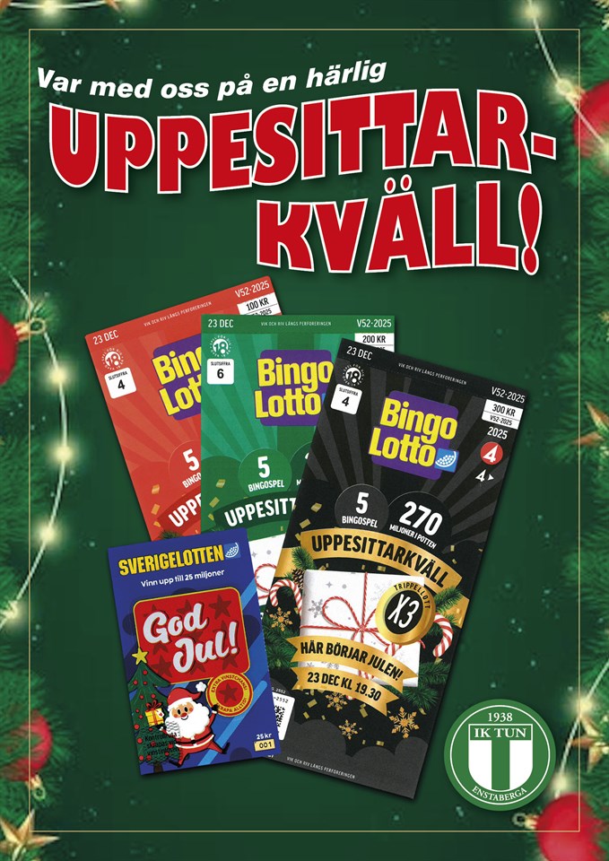 Julen närmar sig och nu har våra lag börjat sälja bingolotter till den stota Uppesittarkvällen den 23 Dec samt till Nyårshelgen. Lotter finns även till försäljning på Ik Tun:s kansli på Enstaberga IP.