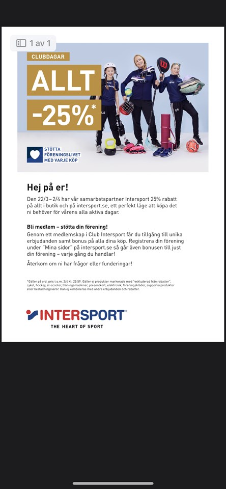 Till och med idag 2/4 har vår samarbetspartner Intersport 25% på allt i butik och på intersport.se, ett perfekt läge att köpa det ni behöver för vårens alla aktiva dagar. När du handlar på Intersport är du samtidigt med och stöttar IK Vista. Säg till i kassan eller välj IK Vista som förening under ”Mina sidor” så får IK Vista några procent för varje köp ni gör som Clubmedlemmar. Bra va? Detta gäller för dig som redan är eller blir Clubmedlem hos Intersport. F-14/15 2 apr 2023 0kommentarer