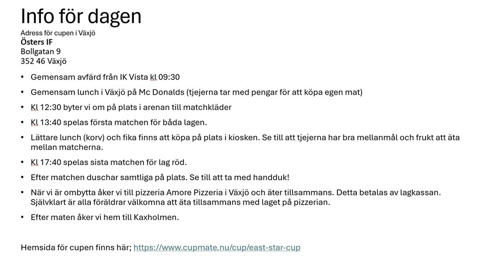 Hej! Tack till alla som anmält att ni kan vara med och skjutsa till cupen. Vi konstaterar att vi har gott om platser att samåka. Vi möts kl 09:20 på Vistavallen för gemensam avfärd kl 09:30. I bifogad bild ser ni info för cupen. Komplett spelschema och lagfördelning ser ni i PDF-filen under dokument. Vi har fått lite nya speltider för dagen. Titta gärna på tiderna för respektive lag innan cupen. Kommentera på detta inlägg om ni har några frågor! Vi ses! /Tränarna F-14/15 27 feb 0kommentarer