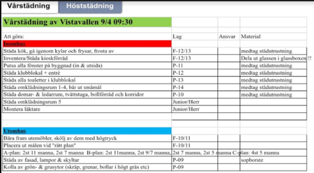 Hej P09 Snart drar fotbollsäsongen igång precis som tränarna skrev. Innan dess ska vi tillsammans hjälpa till att göra vår fina anläggning städad och iordningsställd! Detta verkar vara den sista städningen som P09 är med på. Från och med hösten ser det ut att vara påfyllt med nya yngre lag som "tar över" dessa uppdrag. Denna vårstädning innebär att P09 städar av fasad, lampor, skyltar samt går över grus, gräsytor, letar bollar osv i det höga gräset. Anmäl er nedan i kommentarsfältet. Brukar räcka med fyra/fem personer. (uppgiften att leta bollar mm i höga gräset passar ju bra för killarna att hjälpa till med ;) Har tittat tillbaka lite vilka som städat innan. Vår 2020: Palmér,Tubbin, Wallmo, Park, Olofsson, Knutsson och Bernhardsson Höst 2020: Vassnes, Eskilsson, Stjernberg, Joakimsson Vår 2021: Vassnes, Joakimsson, Wallmo, Bernhardsson Höst 2021: Tullebo, Sellstrand, Tubbin, Olofsson Mvh Jenny Bernhardsson