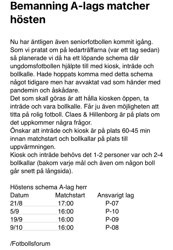 Hej Som ni ser på bifogat foto så har vårt lag ansvar för bemanning söndag 19/9 på A-lagsmatchen. Det behövs 1-2 personer som har kiosken och 1-2 personer som tar inträde samt 2-4 bollkallar. Man behöver finnas på plats 45-60 min före matchstart. Skriv upp er i kommentarsfältet nedan. Mvh lagföräldrarna P09 P09 16 aug 2021 4kommentarer