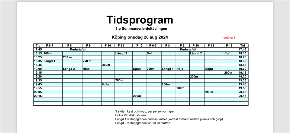 Här kommer tidsprogrammet för kvällens sommarserie! Kvällen börjar med kurirstaffett som börjar 17.45 så kom gärna i tid så ni hinner vara med på uppvärmning och indelning av lag :) Grupp 5 28 aug 2024 0kommentarer