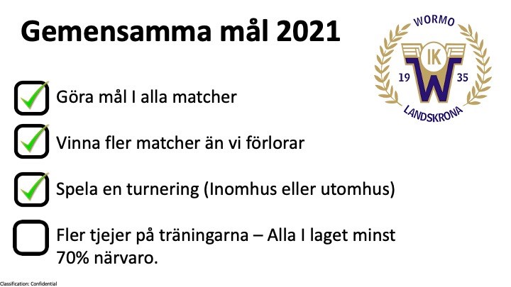 Hej Igår hade vi avslutning med F09. Vi kollade på målen vi satt upp och tjejerna fick välja vad våra mål för 2022 skulle vara. Man kan säga att 2021 var otroligt bra, där vi klarade 3 av 4 mål. Och där det sista målet nästan klarades. I bifogat dokument hittar ni målen för 2021 och även de nya för 2022. Nu tar vi vila och ses igen början av januari. Träningen kommer börja onsdag den 12 januari. God jul och tack för i år Sofie