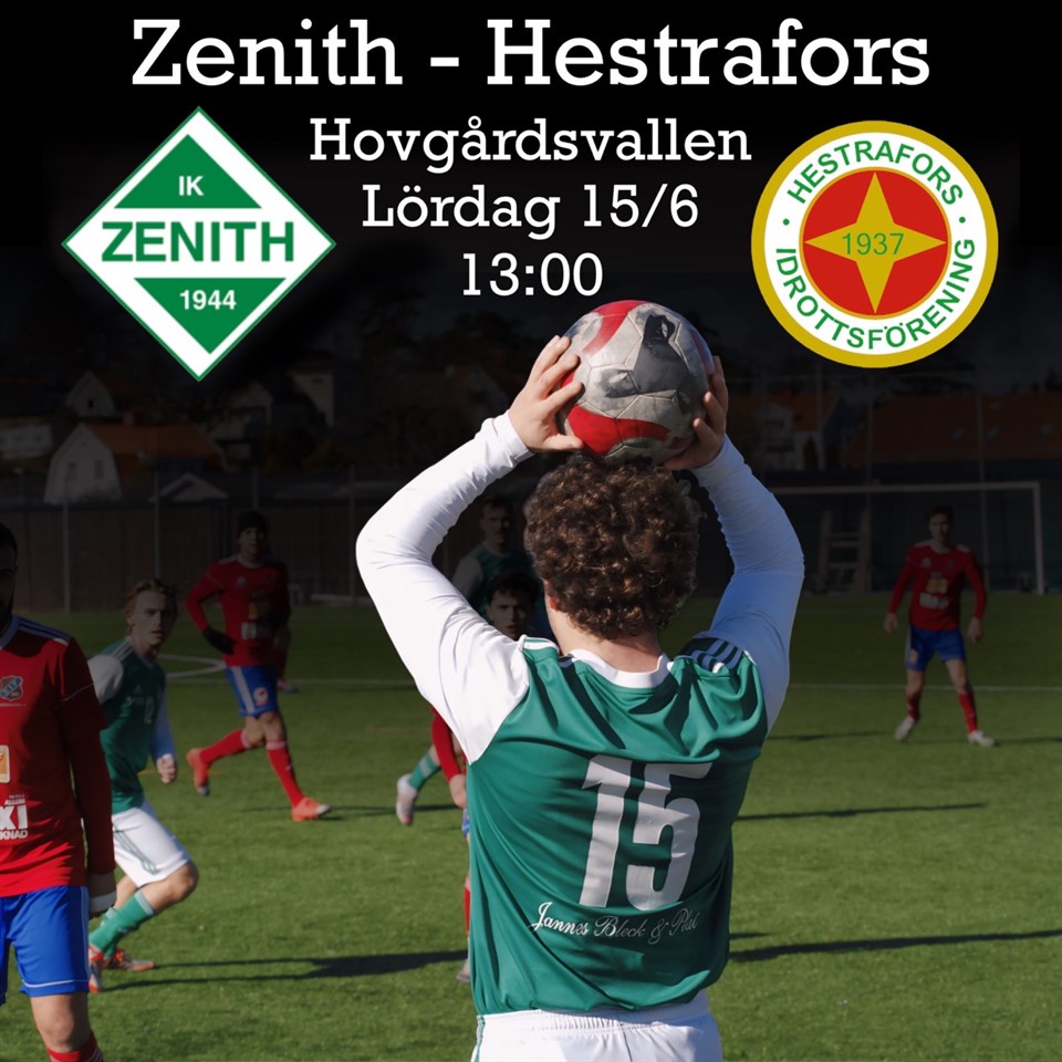 I sista matchen innan serien vänder så ställs Zenith mot serieledarna Hestrafors IF. Zenith börjar matchen bra och gör 1-0 efter en kvart och strax efteråt får Hestrafors en spelare utvisad. Hestrafors lyckas kvittera strax innan halvtidsvilan, men i andra halvlek kommer Zenith igen och vinner till slut matchen med 3-1. Hestrafors är ett stabilt division 3 lag och har legat där kontinuerligt sedan 2012, med undantag för 2016 då man var nere och vände i 4:an under en säsong. I år har Hestrafors spelat utmärkt och de leder serien inför denna match. Zenith ligger på femte plats och hela nio poäng efter Hestrafors. För att kunna få häng på toppen så behöver Zenith vinna mot serieledarna idag. Zenith börjar matchen bra och kommer runt på vänsterkanten flera gånger och skapar också flera ganska bra målchanser. 14 minuter in i matchen så har Sebastian Hansson och Calle Frank ett bra samspel på sin vänsterkant och de lyckas skapa en hörna. Det blir en hörna som Julian Cuklev är först på och efter en bolltäckning så blir det en ny hörna. Den andra hörnan slås i en hård och ganska flack bana in mot mål. Robin Ewen kommer in mot den främre ytan i full fart och nickar bollen hårt ner i backen och in i mål. - Vi körde vår andra hörnvariant där jag går på främre, så Adam slog in den hårt på främre och då var jag där, säger Ewen. I minut 17 vinner mittfältaren Leon Kornbakk bollen och är på väg att bli helt fri när han fälls bakifrån. Domaren drar kvickt upp det röda kortet och visar ut Hestrafors David Edvinsson. Detta är fjärde matchen där Zenith hamnar i numerärt överläge pga. motståndarnas röda kort. Tidigare har Zenith fallit ner i tempo när man blivit en man mer. Så blir det till viss del även denna gång. Man får ett stort bollinnehav och Hestrafors backar hem och satsar på långbollar och ställer hoppet till fasta situationer. Zenith pressar på men i minut 43 kommer Hestrafors upp och efter några vunna närkamper och en nickskarv så blir plötsligt Hestrafors Samuel Nilsson helt fri mot Zeniths målvakt. Lukas Mattsson kommer ut och försöker täcka men Nilsson rullar säkert bollen förbi Mattsson och in i mål. Första halvlek slutar 1-1. I andra halvlek blir det lite mer fart i Zeniths spel och man skapar några målchanser. I minut 52 har mittbacken Max Gummesson tagit sig upp i straffområdet och gör en fin nickskarv som går hårt i ribban. Några minuter senare kommer Ewen runt på högerkanten och slår ett långt inlägg och vid bortre stolpen dyker Isaac Jonsson upp och stöter in 2-1 till Zenith. Zenith fortsätter att pressa på, men Hestrafors är inte ofarliga och är ibland upp och skapar lite oroligheter runt Zeniths mål. Nu kommer även regn och väldigt kraftig vind vilket gör det svårare att få precision i passningarna. I minut 84 har Loke Ballard och Adam Bjerkhede ett fint samspel på högerkanten och Ballard bryter in och avlossar ett skott som målvakten räddar, men det blir retur och där dyker Jonsson upp och skjuter in 3-1 till Zenith. Matchen slutar med en skön seger för Zenith som nu har häng på topplagen. Man ligger nu på 3:e plats efter Dalstorp och Hestrafors. Tvåmålsskytten Jonsons sammanfattar matchen på följande sätt: - Jag tycker vi var bättre första kvarten, sen åker de på ett rött och då förändras matchbilden rätt drastiskt. Vi tappar det lite, vi blir lite för bekväma, men sen i andra halvlek så tog vi tillbaka initiativet igen, säger Jonsson. På bilden ser vi målskyttarna Jonsson och Ewen.