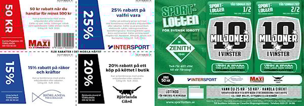 2. Fysiska rabattkuponger = Pengarna tillbaka direkt! – På baksidan finns fyra fantastiska rabatterbjudanden från några partners. På en enda kupong har man fått tillbaka pengarna på lotten. I denna omgång finns ICA Maxi med, Björlanda gård, Björlanda Fisk och skaldjur samt Intersport