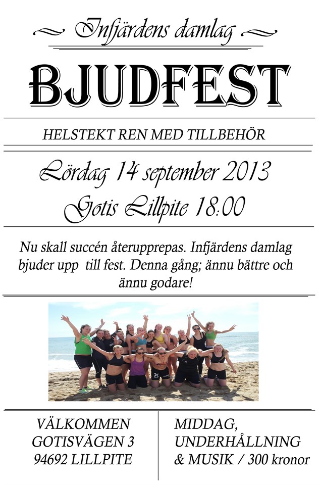 Välkommen på bjudfest. Damlaget bjuder upp till dans, musik och helstekt ren. Boka av 14 september i kalendern klockan 18.00 till sent in på kvällstimmen. Platsen blir på Gotis i Lillpite. Varmt välkomna att återupprepa vårens succé. OBS! Anmälan krävs. Detta gör ni smidigast via någon i laget, alternativ på infjardenssk@hotmail.se