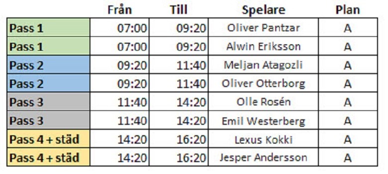 Hej. Här kommer schema för arbetspassen under Igelkotten Cup samt instruktioner. Kolla över vilka tider ni har blivit tilldelade. Samtliga pass är på Plan A Det ska vara två personer på varje pass och alla anmäler sig i cupcentrat när man kommer för vidare instruktioner. Uppdraget är matchvärdar med främsta uppgift att se till att rätt lag är på rätt plats, på rätt tid och att vara ett stöd till domarna. En instruktion finns på plats till de som ska ha ett pass. Alla bör komma i tid innan sitt pass och ingen kan lämna förrän nästa pass är fyllt. Extra viktigt är att man gärna får komma i bra tid innan första passet. Sista passet står en sluttid för sista matchen men efter denna så hjälps vi alla åt att städa av arenan och ingen lämnar förrän allt är klart. Kallelse för spelarna kommer separat inom kort. Pojkar 12 år (f.2012) 14 feb 2024 0kommentarer