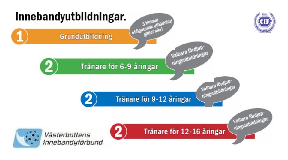 Ny chans att gå grundutbildningen samt fördjupningsutbildning innebandyspelaren Röd. Den 27:e november finns det en ny möjlighet att gå grundutbildningen. De som inte har gått denna uppmuntras och uppmanas att gå den då den är grunden för hur vi utför träningar i innebandy. Grundutbildningen är den första utbildningen du går oavsett vilken åldersgrupp du tränar. Efter genomförd grundutbildning får du tillgång till de olika fördjupnings-utbildningar som finns inom din åldersgrupp. Utbildningen är endast på 3 timmar där SIU-modellen och dess filosofi är i fokus. Sista anmälningsdag den 12:e november. Efter grundutbildningen kan du fritt välja bland de fördjupningsutbildningar som finns. Anmäl till kansliet om du vill gå någon av utbildningarna. Föreningen står för kostnaden. Fördjupningutbildning för tränare för 9-12 åringar hålls den 14:e och 21:a november. Utbildningen heter "Innebandyspelaren Blå". Praktisk och teoretisk utbildning för dig som vill lära dig övningar och hur ditt lag tränar bäst. Bland annat får du en pärm med exempel på övningar. Utbildningstid: 2 kvällar á 3,5 timmar. Sista anmälningsdag den 9:e november. Fördjupningsutbildning för tränare 12-16 åringar hålls den 27:e november och 4:e december. Utbildningen heter "Innebandyspelaren Röd". Praktisk och teoretisk utbildning för dig som vill lära dig ytterligare övningar och hur ditt lag tränar bäst. Bland annat får du en pärm med exempel på övningar. Utbildningstid: 4 timmar. Utbildningstid: 2 kvällar á 3,5 timmar. Sista anmälningsdag är den 12:e movember. Anmäl till kansliet eller på iBIS (under fliken "event") om du vill gå någon av utbildningarna. Föreningen står för kostnaden. Innebandysektionen 6 nov 2017 0kommentarer