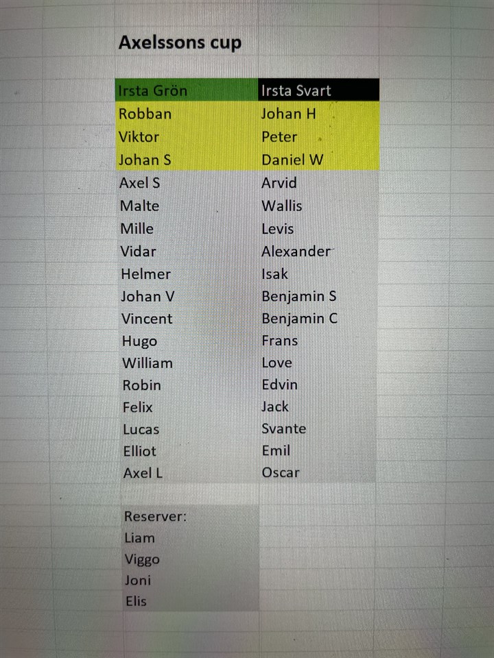 God kväll! På torsdag startar äntligen Axelssons cup där vi i år har anmält två lag. Gruppspelet spelas torsdag och fredag med A och B finaler på lördag. Bifogat finner ni lagindelning samt spelschema. Samling 30 minuter innan match. Speltid 2x20 minuter. Observera att lag grön saknar målvakt så förbered era barn på att de kan behöva stå i mål om vi inte hittar ett annat alternativ. Kontakta Robban som är ansvarig ledare vid sjukdom mm så vi kan kalla in reserver så snart som möjligt. Axelssons Cup Med vänlig hälsning, Ledarna