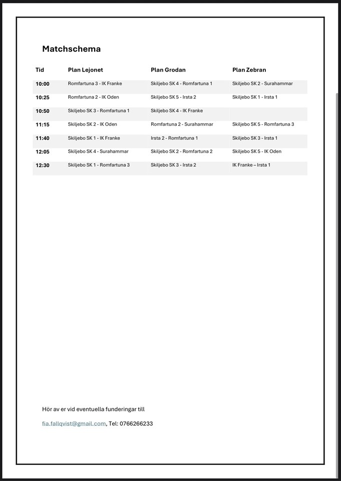 Hej på er! Det går fortfarande bra att anmäla sig till poolspelet i helgen, så passa på ni som ännu ej bestämt er. Ändrade matchtider: båda våra Irsta lag spelar nu sin första match 10.25. Så vi tar en gemensam samling kl 9.50 på Hamre IP. Vi avslutar tillsammans med alla andra lag för medaljutdelning ca kl 13. Matchkläderna har kommit! så imorgon på träningen kan man hämta ut dom och sedan såklart ha de på lördag. Info sen tidigare. Anmälan Samma som träningar via laget.se. notera att Anmälan stänger dagen innan så vi har en chans att se vilka som ska komma. Utrustning Matchspel kräver benskydd, det är likabra att köpa det och ha på träningarna med så man vänjer sig och skyddar benen. Tex Stadium outlet säljer för runt 170kr har jag för mig. I övrigt kläder att ha på sig mellan matcherna. Mat och dryck SSK fixar en kiosk där man kan köpa mat och fika. Men tänk på att det är några timmar och det är bra om barnen har energi när det är dags att spela, så ta med något att snacksa på. Sen vatten såklart bra att ha med. Samling Vi samlas allihopa för lagindelning och gemensamt uppsnack 35 minuter innan första matchen vilket betyder 9.50. Vi samlas i närheten av matchplanerna. Matcherna 3 mot 3 med småmål och sarg/nät runt planen. Det är 4 perioder a 3 minuter. Mellan varje period pausar matchen för spelarbyten. Vi låter alla spela lika mycket. Man "får inte räkna poäng" enligt skolboken. Det jag tolkar in är att man inte ska lägga för mycket fokus på resultatet utan fokusera på att ha kul och självklart fira om vi gör mål! Hör av er vid frågor! Mvh Felix