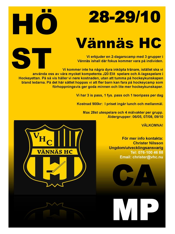 Än finns det några platser kvar så passa på att anmäl era barn! Dela gärna! 900kr per barn. Anmälan är EJ giltig förrän bet via swish genomförts! Betalningsuppgifter kommer när du anmält ditt barn. Vännäs HC spelare erhåller 20% rabatt på campen! Anmälan Höstlovscamp 2019 För mer info kontakta: Christer Nilsson Ungdoms / Utvecklingsansvarig Tel: 076-1004688 Christer@vhc.nu J18 Div 1 16 sep 2019 0kommentarer