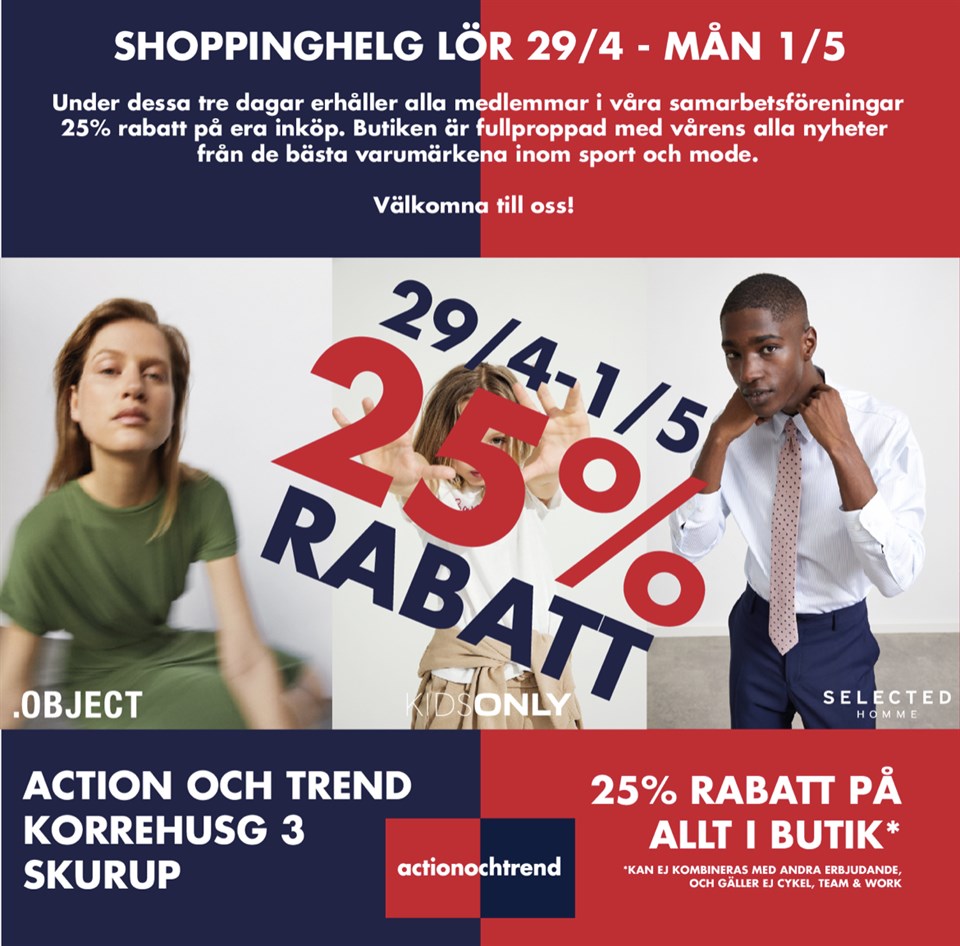 Vi på Action och Trend bjuder in våra samarbetsföreningar på en riktigt härlig shoppinghelg 29 april – mån 1 maj där vi erbjuder era medlemmar 25% rabatt på sortimentet.* Ni hittar härliga vårnyheter i butiken från de bästa varumärkena inom både sport och mode! Välkomna hit! *Rabatten gäller ej på, arbetskläder, cykel, föreningskläder, presentkort eller gåvokort.