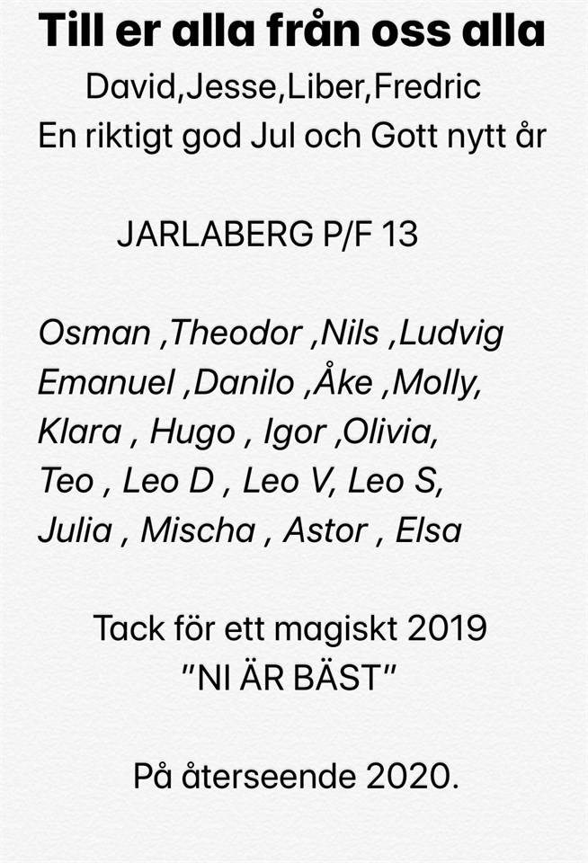 Till er alla från oss alla David,Jesse,Liber,Fredric En riktigt god Jul och Gott nytt år JARLABERG P/F 13 Osman ,Theodor ,Nils ,Ludvig Emanuel ,Danilo ,Åke ,Molly, Klara , Hugo , Igor ,Olivia, Teo , Leo D , Leo V, Leo S, Julia , Mischa , Astor , Elsa Tack för ett magiskt 2019 ”NI ÄR BÄST” På återseende 2020.