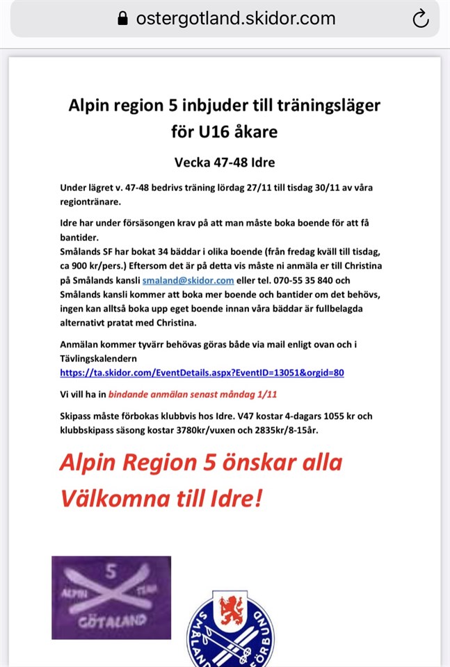 Anmälan Smålandsläger - v. 48 Sälen/Tandådalen - träning lördag 4/12 till tisdag lunch 7/12 Träningslägret avser åkare födda 2006-2011. Pris: Vuxen 2 553 kr (med Skistar All, 1 453 kr) Ungdom (aktiv född 2011 och tidigare) 1 337 kr (med Skistar All, 453 kr) Ungdom 2 177 kr (med Skistar All, 1 293 kr I priset ingår: Träning med tränare både från JSLK och andra smålandsklubbar Boende i 8-bäddsstuga Lunch, lördag-tisdag Liftkort Vi åker i egna bilar och planerar logistiken när vi vet hur många vi blir. Frukost och middag fixat vi stugvis på plats. Betalning görs på Swish 123 649 63 35 , (i andra hand så är BG 5530-0594) innan avresa. Märk betalning med Smålandsläger och namn. Anmälan senast 1/11. Vid frågor: Louise Hammerin 073-685 36 93 anmäl här Kommentera gärna nedan ifall ni åker, så ser kompisarna. :) Välkomna!