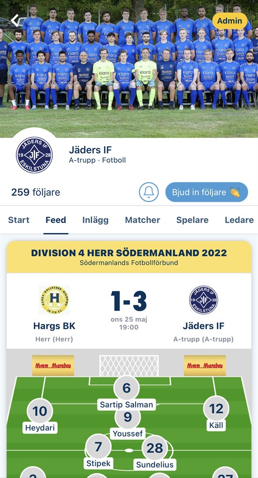 Här kommer en länk för att följa vårt lag Jäders IF A-trupp i Min Fotboll. I appen kan vi alla fota, filma, heja och rapportera live från våra träningar och matcher. Följ oss i Min Fotboll och sprid vidare till alla du tror kan vilja följa och heja fram vårt lag i en fantastisk förening! https://minfotboll.app.link/VGRQPVwpkqb Vi finns även på Instagram, följ oss på https://instagram.com/jadersifherr?igshid=YmMyMTA2M2Y= A-lag Herrar 27 maj 2022 0kommentarer