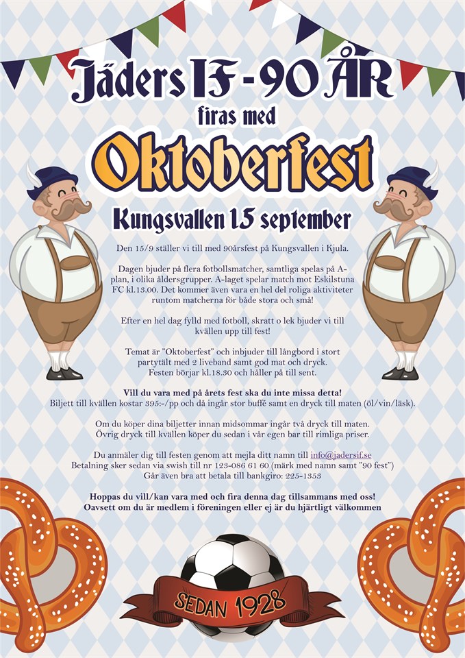 Lördagen den 15/9 kommer Jäders IF arrangera Oktoberfest i Kjula. Det blir buffé, välkomstdrink och en ytterligare dryck samt kaffe o kaka. Två liveband uppträder i stort öltält. Pris 395:-/person. Anmälan till info@jadersif.se och betalning till Swish 123-086 61 60. Kolla gärna med vänner och bekanta så vi blir ett riktigt stort gäng. Vi siktar mot 150pers men vi behöver ert stöd. Vänta inte med anmälan utan passa på när det händer roliga saker i vårt samhälle! Vi kommer dessutom ha dagen fylld av roliga aktiviteter. Ungdomsmatcher mellan 11-14 och sedan toppmöte Jäders IF mot EFC kl 15.00. Det kommer finnas servering under hela dagen. Dessutom hoppborg, lotterier, ponnyridning, hastighetsskjutning, loppis (bord bokas för 150:-/bord). Kom och stötta det lokala föreningslivet och häng med på en rolig festkväll! Varmt välkomna!!
