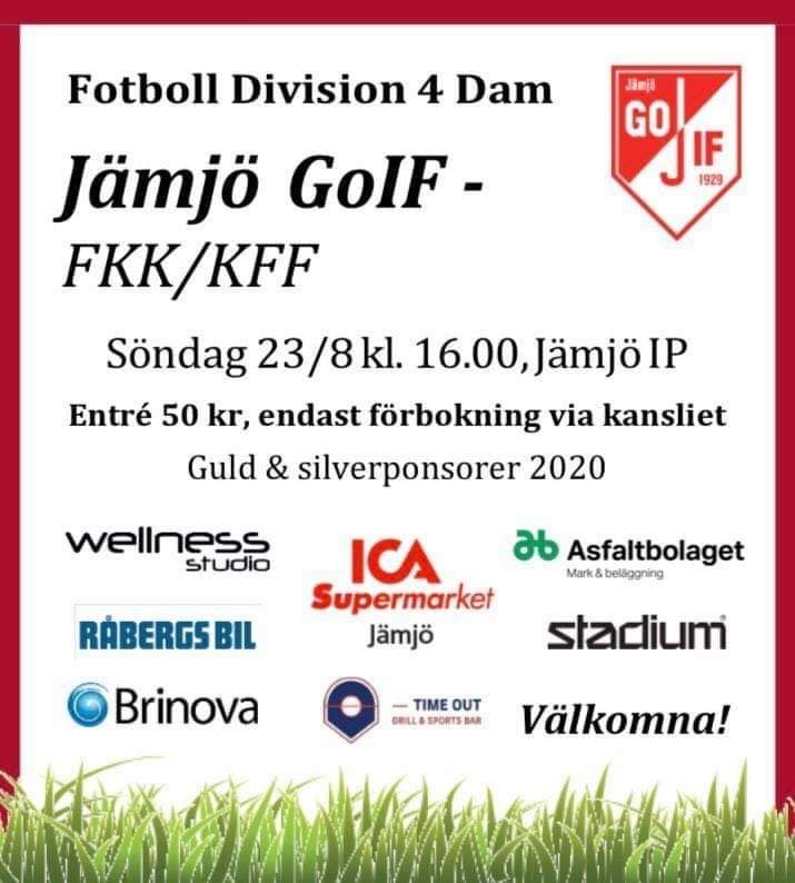 På söndag 23/8 kl. 16.00 kommer FKK/KFF U till Jämjö för match i Div 4 Södermöre Dam. Förköp av biljetter sker via kansliet på tel. 0455-59021 eller via mail jamjokansli@gmail.com. Glöm inte att köpa 50/50-lotter. Välkomna. Damlaget 19 aug 2020 0kommentarer