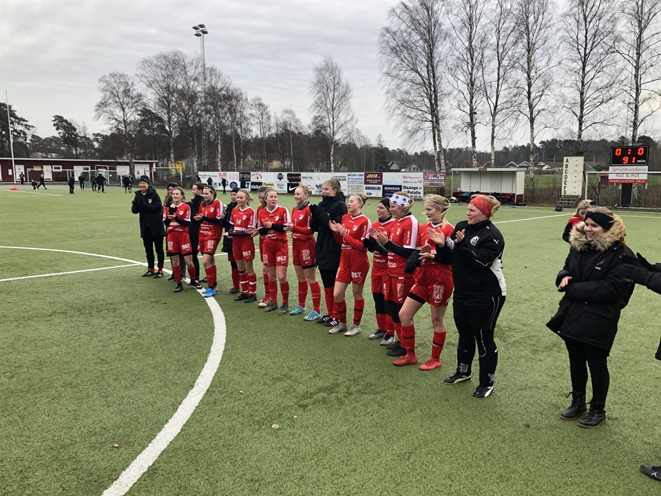 Äntligen sol på Jämjö IP och match mot Ramdala. En match som överlag såg bra ut och där vi gör mycket bra saker. Lagbygget börjar ta form och mixen av äldre med rutin och yngre med entusiasm kommer mer och mer till sin rätt. I första halvlek får vi stundtals bra rull på bollen och har bra kontroll på det som händer på plan. Vi leder med 1-0 efter första efter mål av Elin. I andra halvlek tvingas vi visa inställning och kämparanda där vi inte riktigt kommer upp i samma niva som i första även om vi också då gör mycket bra saker. Halvleken slutar 1-1 efter mål av Isabell. Vi har ett bra "go" i laget och visar att vi inte viker ner oss. Bra genomförd match. Målen: Elin, Isabell Laget idag: Målvakt: Majken Back: Camilla, Alva H, Linda, Alva S Mittfält: Elin, Alva K, Ebba, Sara Anfall: Emma, Isabell Avb. Lovis, Gina, Maja, Hanna, Caroline, Annelie, Nea