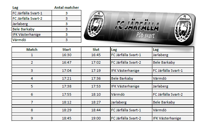 Som sista aktivitet för året kör vi en träningsturneringen. Den 13 dec kl 16.30-19.00 är det matcher i Järfälla Sporthall - se länk medan för reseinfo. Samling 15.10 vid Tempo. Meddela tränarna om ni åker direkt Kom ihåg att svara via bokat! Tid: 16:30-19:00 Adress: Mjölnarvägen 3,177 41 Järfälla ”Jakobsbergs simhall” http://www.hitta.se/simhallen+i+jakobsberg/j%C3%A4rf%C3%A4lla/hMZCwXmUU1?vad=jakobsbergs+simhall&var= Servering : Det finns en gatukök/fik i simhallen som säljer allt från hambugare till mackor. Alla matcher kommer att spelas 15 minuter och utan halvlek. Det kommer att vara två minuter mellan varje match, så förbered er på att gå av plan så snabbt som möjligt när mathen är slut. P-2006 6 dec 2014 0kommentarer