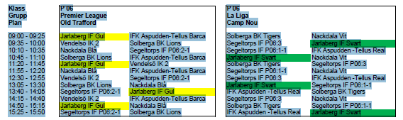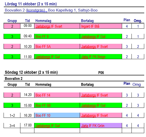 Hej Här kommer info om spelschemat för helgen 11 och 12 oktober. Vi spelar lördag förmiddag och söndag eftermiddag. Det blir 4 matcher per lag Avfärd 8.15 (för de som spelar i svart lag) och 9.00 (för de som spelar i Gult lag) från Tempo. De som åker direkt meddelar alla tränare det. Alla som ska vara med och spela måste vara där spelklara senast 20 minuter innan match. (Inte ok att komma 3 minuter innan.) Vilket lag som ert barn spelar i kommer under veckan P-2006 5 okt 2014 0kommentarer