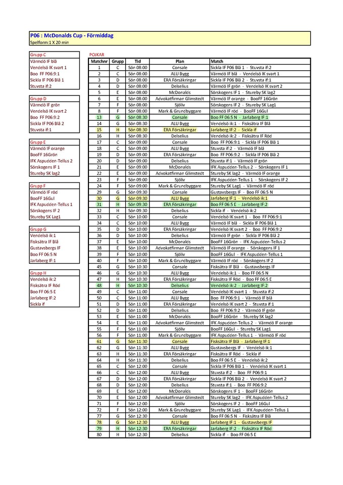 på söndag den 22 spelar vi McDonald´s cup i Värmdö (2 lag anmälda, se info nedan. Värmdö IF och McDonalds hälsar Er varmt välkomna till McDonalds Cup 2013! Datum: 2013-09-22 Tid: 08.00 – 13.00 och 13.00 -18.0 Plats: Värmdövallen Antal deltagande lag: 80 lag varav 60 pojklag och 20 flicklag Antal matcher: 4 matcher per lag Regler: Sanktans 5-manna regler Spelprogram finns bifogat detta brev. Det är totalt 80 lag som deltar i cupen och hälften spelar på förmiddagen och andra hälften på eftermiddagen. Parkering Totalt är det ca 950 spelare som kommer att delta i McDonalds Cup och vi räknar med att det kommer mycket folk med bil. Vi har en del parkeringsplatser vid idrottsplatsen, men inser att de inte kommer räcka till alla. Vi kommer att ha parkeringsvakter som hjälper er, men platserna är begränsade och vi rekommenderar samåkning om möjlighet finns. När platserna vid Värmdövallen är fyllda kommer vi hänvisa till en parkering ett hundratal meter längre fram vid Konsum där det finns infartsparking. Från den parkeringen finns det en gångväg upp till Värmdövallen. Vid ankomst När ni anländer till Värmdövallen ber vi er att anmäla er vid sekretariatet som ligger vid den röda byggnaden bredvid den nedre konstgräsplanen. Varje lag kommer att få dryck och frukt som är sponsrat av McDonalds. Prisutdelning Efter ni har spelat er sista match ber vi er komma upp till sekretariatet för en prisutdelning. Alla spelare får bland annat en medalj. Mat & Dryck Bredvid den nedre planen finns en byggnad innehållande både omklädningsrum, toaletter och cafeteria som kommer vara öppen hela dagen. Dessutom kommer det finnas tält där vi säljer nygrillade hamburgare och korv. Aktiviteter Förutom fotbollsmatcherna kommer det finnas ansiktsmålning och ballongutdelning för barnen. Vid frågor gällande spelschema kontakta John Nävertun, john@navertun.se, 010-458 63 41 Övriga frågor kontakta Lars Ahlm, lars.ahlm@fmv.se, 070-982 56 53