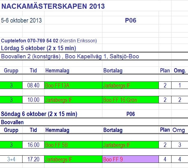 Hej den 5/6 oktober kommer vi att spela Nacka Mästerskapet i Boo (1 lag anmält + 1 står i kö). Samling Lördag 7:50 tempo - 8:10 Boovallen Söndag 14:45 tempo - 15:15 Boovallen spelprogrammet hittar ni i den bifogade bild. Info om cupen hittar ni genom länken http://www.booff.com/club/page/public/index/18699