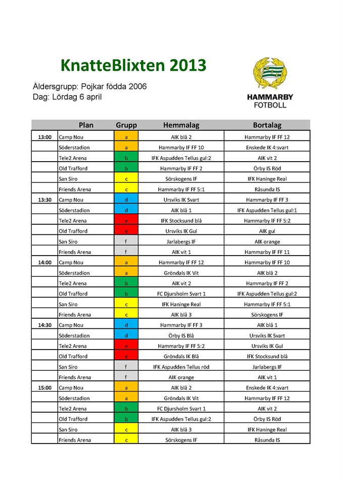 Den 6 april spelar vi KnatteBlixten cup. KnatteBlixten arrangeras av Hammarby vid Hammarbyhöjdens konstgräsplan pojkar 2006 - lördag 6 april (eftermiddag) Varje enskilt lag spelar 4 matcher a‘ 1 x 25 minuter under fyra timmar. Vi spelar första matchen 13:30 och sista klar 16:30. Vi träffas på plats senast 13:00!!! Samtliga lag erhåller en lagpokal. Samtliga spelare erhåller medalj. Fairplay pris delas ut inom varje åldersgrupp. http://www.cumap4.se/cuponweb/knatteblixten3248.htm spelprogram http://www.cumap4.se/cuponweb/upload/3248_menu_link_sve_5_1.pdf P-2006 1 mar 2013 0kommentarer