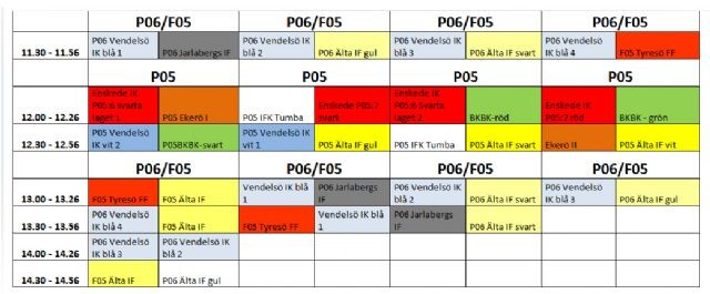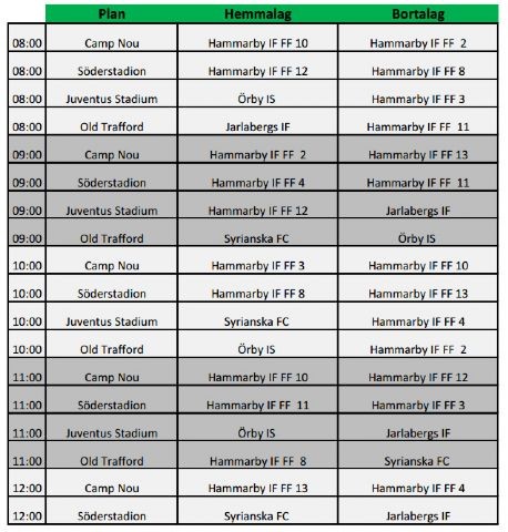O.B.S tag med 100kr till träningen på söndag så vi kan betala cupavgiften. Hammarby IF FF Under dagarna 6-9 april spelas årets upplaga av KnatteCupen Påsk vid Hammarbyhöjdens konstgräsplan. Speldagar: Fredag (långfredag) 6 april - Pojkar födda 2005 Lördag (påskafton) 7 april - Pojkar födda 2004 Söndag (påskdagen) 8 april - Pojkar födda 2003 Måndag (annandag påsk) 9 april - Pojkar födda 2006 kl 08:00-20:00 Priser: Pokal till samtliga deltagande lag. Diplom till samtliga deltagande spelare. Specialpris till åldersgruppens "rent spel" lag. Spelform: - Samtliga lag spelar 4 matcher var i vänskapsform. - Matchtid 2 x 15 min. - 5-mannafotboll, fria antal byten är tillåtna. - Inga så kallade "utsparkar" från målvakten får göras, spelet startas via "inspark" på liggande boll alternativt via utkast från målvakten. - Tillbakaspel till målvaktens händer och fötter tillåts. - Hemmalaget enligt spelprogrammet gör avspark vid matchstart. - Lagen byter sida efter halvtidsvilan. - Bortalaget byter tröjfärg vid lika tröjfärger (domarens bedömning gäller), västar finns att låna i informationstältet. Tränarutbildning: Samtliga lags tränare inbjudes till vår tränarutbildning "tvåfotsteknik - hur vi leker och lär fotboll i vår knatteverksamhet. Utbildningen äger vid Hammarbyhöjdens konstgräs vid två olika tillfällen under maj månad, inbjudan skickas per e-post till samtliga deltagande lags kontaktpersoner. Loppmarknad: Vill ditt lag tjäna pengar samtidigt som ni spelar, loppmarknaden är öppen för alla. Se separat brev för information kring detta. Servering med grill: finns vid matcharenan. Omklädningsrum: lagen samsas om 4 moderna omklädningsrum på ett vänskapligt och respektfullt sätt. Hammarby IF FF ansvarar inte för borttappade saker. Adress: Hammarbyhöjdens IP, Finn Malmgrens Väg 45. Tunnelbanestation: Hammarbyhöjden (linje 17) Bilparkering: finns i området (gratis), tänk på de boende i området var och hur du parkerar. Vi ser fram emot trevliga fotbollsdagar som går i vänskapens tecken! V ä l k o m m e n t i l l B a j e n l a n d. P-2006 22 mar 2012 0kommentarer