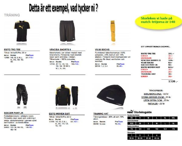 Nu är det dags att beställa träningskläder. Det kommer gå till så att man beställer det man vill ha. beställningarna skall till mig Daniel Dahl d.dahl@bredband.net Vill man ha hela paketet jag tagit fram så kostar det 1320kr och betalas in till våran kassör (Nicolas Fischerström. Mer info kommer senare) vi måste ha pengarna innan vi kan lägga den stora beställningen till stadium. här är mitt förslags paket. P-2006 22 apr 2012 0kommentarer