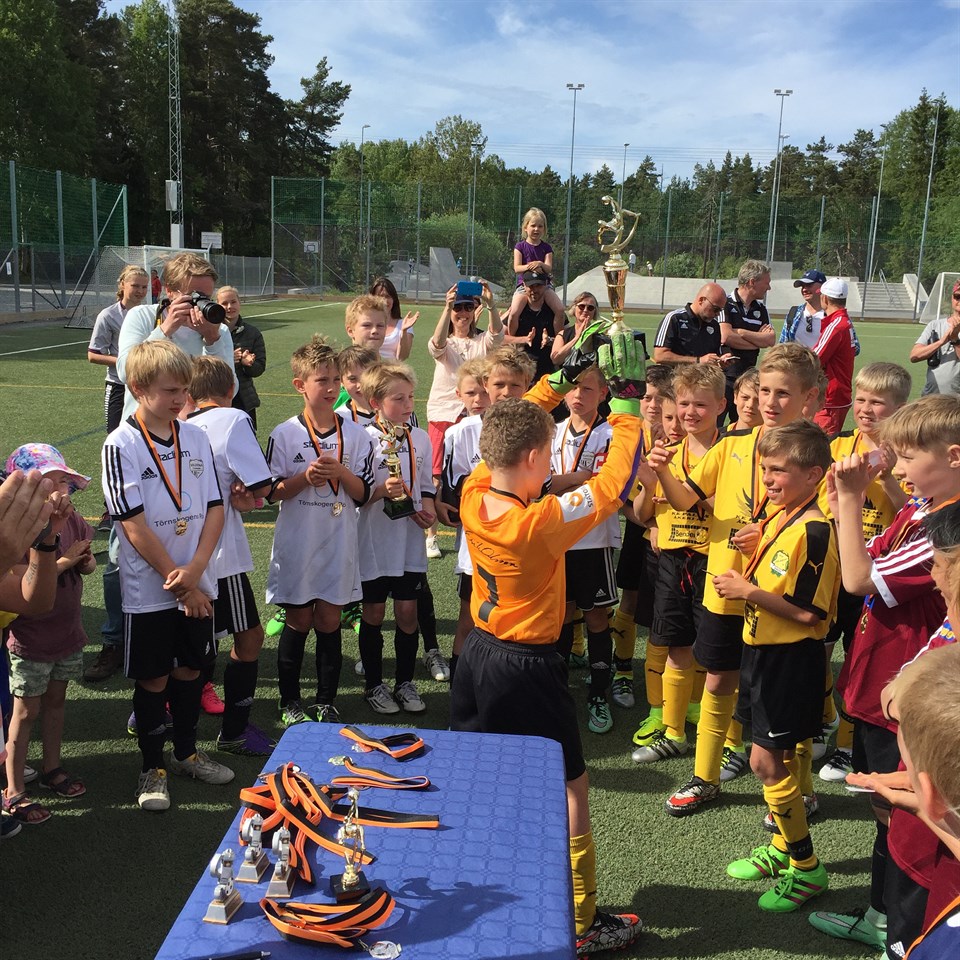 Efter en hel dag i solen stod våra killar som segrare i Saltsjö Boo IFs Nationaldagsturnering. Efter en bra men lite nervös start i förmiddagens gruppspel bjöd killarna på fantastisk fotbollsunderhållning i slutspelet och släppte inte in ett enda mål i kvartsfinal, semifinal och final. Även under gruppspelet på förmiddagen ska det sägas att vi spelmässigt förde alla tre matcherna. Med sex segrar på sex matcher var vi klart värdiga vinnare. Är det viktigt att vinna? Nja, det är inte det viktigaste men det är väldigt, väldigt roligt att få uppleva och det hoppas vi få göra (snart) igen. Det är otroligt roligt att se hur killarna utvecklas och blir bättre på så många sätt. De får bättre teknik, fysik, speluppfattning, hjälper varandra bättre och kämpar mera för varandra. Idag såg vi prov på allt det här. Vi är stolta över att vi rakt igenom alla matcher spelade den (enligt oss) bästa fotbollen utan långa chansbollar. Därigenom tycker vi att vi förtjänade den tur som vi hade i ett par matcher. Som ledare är vi också mycket glada över att ha den bästa föräldraklacken. Tack för att ni hördes bättre än alla andra lags klackar och var en "åttonde spelare" i laget idag! Vissa andra lag uttryckte avundsjuka, ni är grymma! Med förhoppning om fler vackra matcher och stora pokaler, /Tränarna genom Pierre