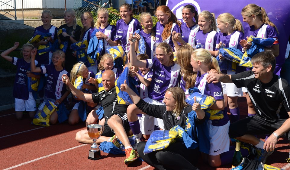 Våra helt fantastiska tjejer vinner finalen efter straffar mot Fortuna FF. Några timmar har nu gått efter straffläggningen och även om vi kommer suga på denna karamellen ett tag till så börjar det så smått sjunka in. 0-1 som blir 1-1 och sedan straffar där såväl målvakt som straffläggare visar kyla och sedan glädjen, prisutdelning, och alla tillresta föräldrar, syskon och släktingar som vill gratulera och fotografera. En stund som man inte ville skulle ta slut, eller ännu hellre upplever igen! Vi reste upp i onsdags med 21 spelare som alla varit med och bidragit, som alla har gjort mycket bra prestationer på sina positioner och som sett till att vi går obesegrade genom gruppspel, kvartsfinal och semifinal med 0 insläppta mål. Det första riktiga skottet på mål tror jag kom i finalen, det visar vilken stabilitet och bredd vi har i truppen. Boendet och den fantastiska maten vi fått under vistelsen i Kungshamn är troligen en bidragande orsak till att det gått så bra. Att få bo lite mer ostört än i en skolsal med många andra lag och att få äta god mat direkt från ugnen (eller grillen) istället för att äta i bamba gav bättre aptit och bättre förutsättningar för återhämtning mellan matcherna. Sedan drog vi en vinstlott i lottningen genom att slippa få möta någon av de andra gruppspelssegrarna förrän i finalen, men någon gång måste ju även vi få dra den vinstlotten. Att sedan få ta revansch på Fortuna som gav oss respass ur förra årets upplaga av Kalles i kvartsfinalen var naturligtvis härligt, men ännu härligare att se att vi tagit fler a steg i utvecklingen och denna gången spelade helt jämnt med dem till skillnad från förra året. Och som vanligt är tjejerna underbart nyfikna, ödmjuka, läraktiga och skötsamma - ytterligare saker som tar oss på vägen mot något riktigt bra och än är vi inte framme :-) Tjejer, ta åt er av allt beröm ni fått av andra boende på vandrarhemmet och allt beröm ni fått för era framfarter i Kalles Kaviar cup 2013, ni är värda vartenda ord! GULD till Jitex F99-tjejerna, fantastiskt roligt!!!! Till slut, tack alla föräldrar och ledarkollegor som sett till att allt flutit på smärtfritt under hela cupen.