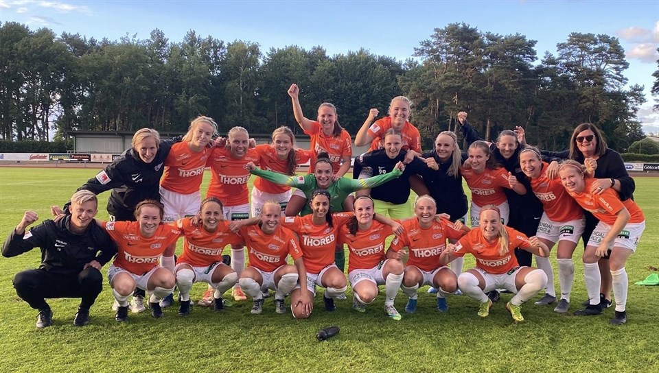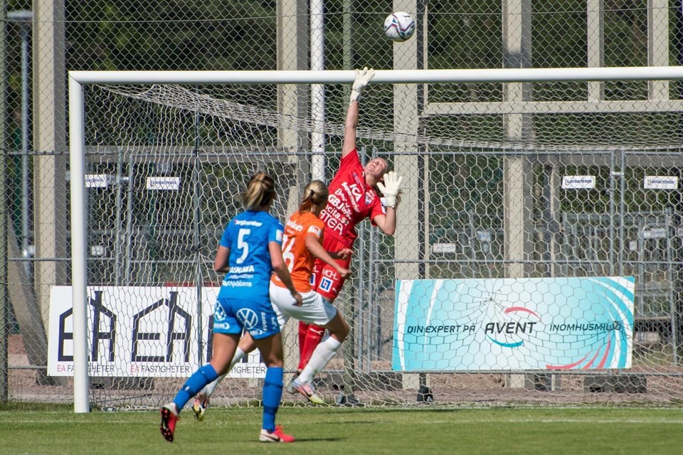 I 27 graders värme och helt vindstilla startade matchen i Kalmar idag på eftermiddagen. I hemmalaget fanns Sara Björk som vaktade Jitexmålet senast 2018, Maja Träff Williams som återfanns i Jitex säsongen 2014 samt tidigare Kungsbacka-spelarna Klara Rybrink och Mimmi Asperot. Jitex ställer idag upp med Hannah, Olivia, Anna E, Julia, Emelie, Ella SY, Linnea, Ella R, Stinalisa, Ida och Nora. Redo att hoppa in var Anna L, Emma, Fanny, Mona, Tindra, Frida och Felicia S. IFK Kalmar börjar matchen bäst och pressar tillbaka Jitex ganska omgående. Redan efter 5 min får de en hörna som studsar i stolpen och på ett Jitexben innan Hannah kan fånga den. Kalmarspelarna signalerade för mål men domaren friade. Och hemmalagets farligheter fortsatte, skott från straffområdet som Hannah räddar, en rensning precis framför en Kalmar-spelare och ett friläge som Hannah får en fot på är alla rejäla chanser för Kalmar men inget mål fram till vätskepausen i mitten på första halvlek. Jitex ställer om emellanåt och kommer fram på vänsterkanten och även fram till inlägg men där finns ingen för dagen orange/vit Jitexare som kan förvalta läget. Efter påfyllning av vätska (vätskepausen) drar Kalmar upp ett anfall och till slut inlägg på vänsterkanten som lyfts in framför Jitexmålet där Mimmi Asperot mötet med en volleybredsida som sitter i nättaket från kort avstånd. Klockan står på 24 minuter och skottet var otagbart för Hannah. Målet blir dock en vändning för Jitex. Nu börjar vi hitta bättre i positionerna och det blir fler och längre Jitexanfall. I 37e minuten snurrar Nora på vänsterkanten väder inlåt vid straffområdet och sätter ett skott över målvakten men inte i ribban och ut. Dock bara 2 min senare får hon underfär samma läge, drar på ett skott som går över hemmamålvakten som är lite långt ut. Det är kvitterat till 1-1 och tjejerna har inte bara jämnat ut resultatet utan även spelet. I andra halvleken är det fortsatt jämnt. Kalmar har kanske lite större bollinnehav men förutom några hörnor där bollen täcks av Jitexförsvarare så är det aldrig riktig farligt. Jitex kommer upp i en hel del anfall i andra halvlek och i den 56e min efter hörna blir det rörigt framför hemmamålet. Ida drar på ett skott från vänster som tar i stolpens insida och studsar ut. Där dyker Nora fram och petar in ledningsmålet 1-2 och gör därmed även idag två mål. Kalmar försöker kvittera men den riktiga anstormningen uteblir. Vi är väl samlade i försvar och kan stoppa anfallen innan de blir farliga. Tindra o Fanny kommer in istället för Linnea o Ida. Vi försvarar oss väl matchen ut och en riktigt bra laginsats ger oss alla poängen idag. Kajsa är euforisk efter matchen: ”Hela laget gör en heroisk insats i den grytan som vi spelar i idag. Det var varmt och helt vindstilla. När vi ändrar lite efter ca 25-30 min och kommer rätt i presspelet tycker jag att vi kan styra dem ganska bra. Innan dess kan de spela igenom oss och då blir det farligt. Men när vi väl pressar rätt så banar det också väg för våra mål.” Kajsa tycker inte vi skall be om ursäkt för segern. ”Nej, jag tycker vi hanterat matchen bra efter första halvtimmen, därefter har de någon farlig hörna men inte så mycket mer. Då tycker jag vi är vassare i avsluten. Den riktiga anstormningen vi sett i slutet av de två första matcherna kom inte på samma sätt idag. Nu är det härlig stämning i bussen och resan hem blir mycket lättare.” Redan på onsdag är det dags igen, åter borta mot Lidköping som säkert är revanschsugna efter förlusten mot Hammarby idag. Sedan avslutas veckan med match hemma mot Sunnanå på söndag kl 13. Foto:Tove Dolff IFK Kalmar