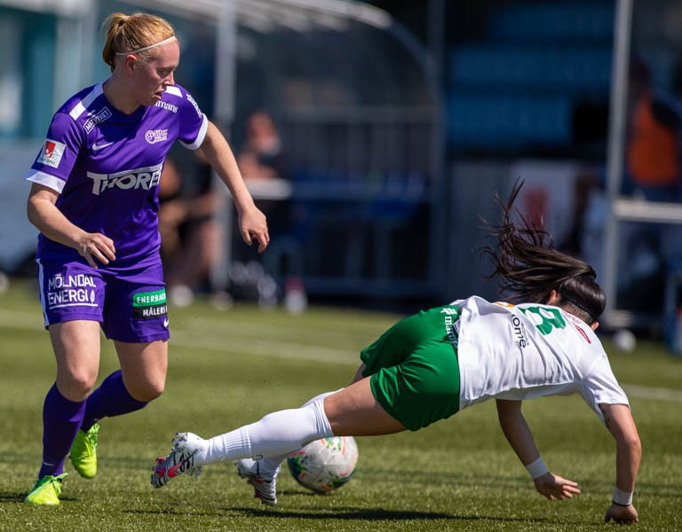 Så kom den då, seriepremiären i Elitettan 2020. Sportexpressen var där och filmade, Mölndalsposten var där och skrev men publiken lyste av kända skäl med sin frånvaro och istället för de vanliga bollflickorna hade några föräldrar tagit plats runt planen för att hämta bollar. Vi följde de uppsatta reglerna efter bästa förmåga och matchen sparkades igång redan kl 11.00 då gästerna hade en tågresa hem till Skellefteå att hinna till. De första 10-15 minutrarna av matchen syns nervositeten hos Jitex-tjejerna, Morön är mer bestämda och kraftfulla i sitt agerande och tar initiativet i matchen. Dock inga farligare målchanser under denna period men ett tecken på att det är en tuffare serie vi spelar i detta året. Men därefter kommer de lila in i matchen och tar över så smått. Vi börjar få se passningsspelet sitta och anfallen kommer ett efter ett. I den 29e matchminuten får vi en hörna från höger som Ella SY slår men den kommer ganska snabbt i retur ut på kanten. Ella avancerar inåt och placerar ett skott i bortre krysset som är otagbart för målvakten, 1-0 och ett härligt premiärmål. Jitex-övertaget fortsätter och i den 43e minuten är Ella på den andra kanten, slår ett inlägg till Stinalisa som tar ner och kan peta ett instick till Anna F påväg fram i straffområdet. Anna slår en bredsida som smiter in mellan målvakt och försvarare, 2-0 och en smakstart på matchen. Andra halvlek hinner knappt knappt börja förrän Morön tar bollen på vänsterkanten, kommer upp och slår ett inlägg och det blir en trasslig situation men många motlägg i straffområdet men K. Guilliou får med sig bollen och kan placera in reduceringen 2-1 i 46e minuten. Jitex replikerar dock direkt och ett långt inlägg från vänster går förbi alla ,em Nora fångar upp och kan hitta Stinalisa framför mål som gör 3-1 i 49e minuten. Morön ger sig dock inte och redan i 52a minuten är det åter reducerat när bollen spelas snett bakåt i Jitex straffområde och R. O'Brien kan vricka bollen åt vänster och placera in ett skott i högra stolproten, 3-2 Det är är en jämn match i andra halvlek, Morön har bra en period i början av halvleken med ett övertag fram till reduceringen och lite därefter, sedan jobbar Jitex-tjejerna sig tillbaka i matchen. Och när 3-3 kommer i 71a matchminuten känns det inte helt rättvist. H. Down vinner en lång löpduell på Jitex planhalva och kan till slut placera in 3-3. I slutet av matchen ser Jitex ut att tagit över matchen, möjligen med hjälp av Moröns taktik som i detta läget verkar vara att försvara sin poäng och utnyttja snabba omställningar och snabba forwards. Tyvärr lyckas det allt för väl när de i 89e minuten fångar up en lång boll och K. Guilliou får dribbla sig igenom försvaret och sätt segermålet till 3-4. Inte alls rättvist i det läget men det är ett bra lag och bra forwards vi möter idag. Kajsa har blandade känslor efter matchen. "Jag är mycket nöjd med vår prestation idag som absolut visar att vi hör hemma på denna nivån, men det är förstås tråkigt att vi missar alla poängen i matchen. Vi är minst värda en poäng, kanske till och med tre. Det är något vi får lära av och en sådan här match skall vi inte förlora när vi blivit lite mer varma i kläderna. Men jag väljer att vi får ta med oss en riktigt bra prestation mot ett stabilt och starkt Elitettan-lag, den skall tjejerna vara nöjda med". Nästa söndag, den 21 juni kl 15.00, är det dags igen. Då tar vi emot Kvarnsvedens IK på Åbyvallen! Foto Mats Andreasson